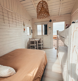 Cada bungalow dispone de una cama de dos plazas y dos camas individuales en cucheta, mesa, banquetas y un baño
